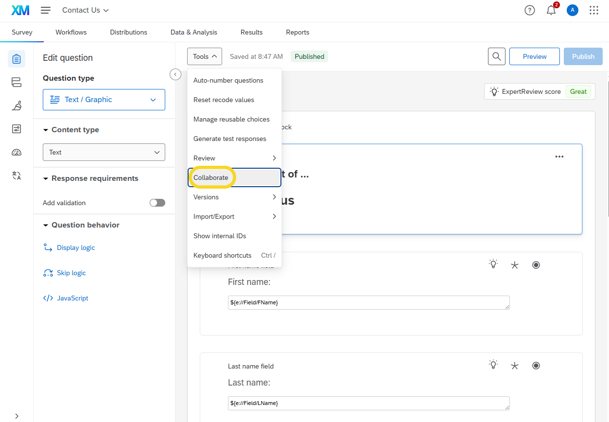 From the Tools dropdown menu, select Collaborate.