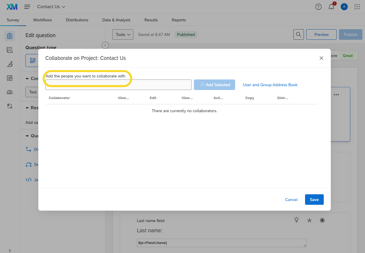You should now see a Collaborate on Project window with a box to add the people you wish to collaborate with on the project.