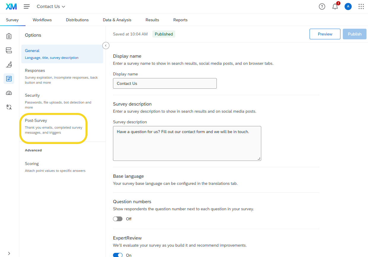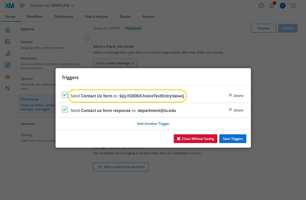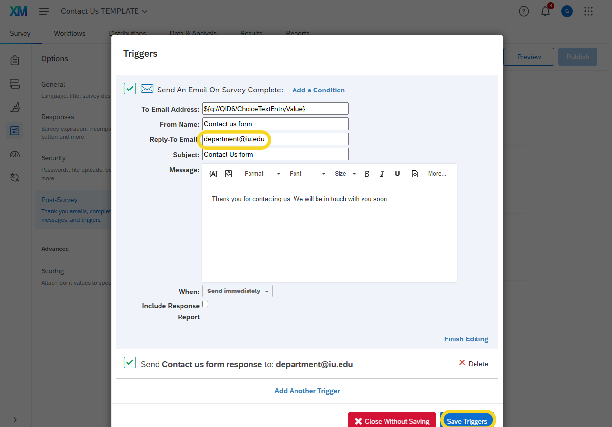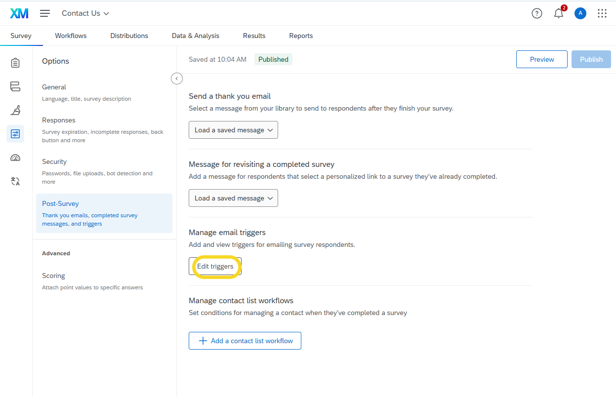 In the Options menu, select Post-Survey. Then, to the right, under Manage Email Triggers, select Edit Triggers.