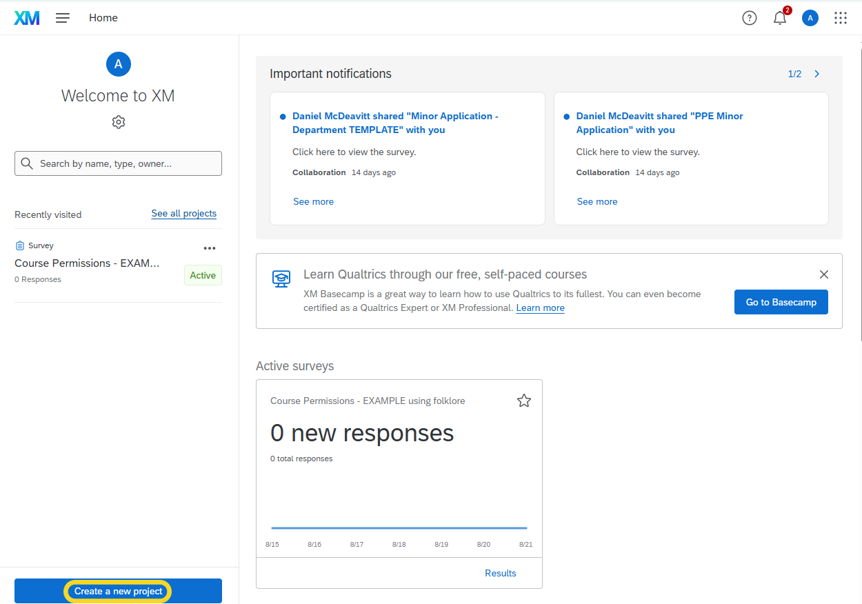On the Qualtrics home screen, choose Create a New Project. It is a blue button located in the bottom left-hand corner of the screen.