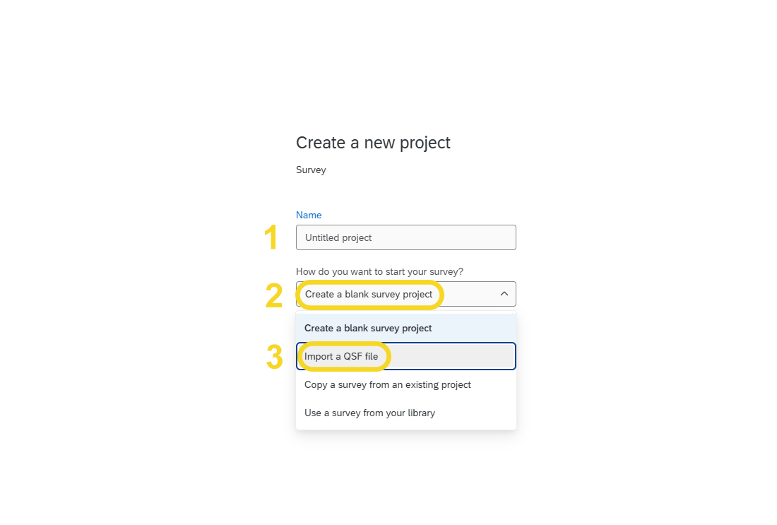 You should now be on the Create a New Project page. First, name your project (example, "Share Your Story Form"). Second, select Create a blank survey project. Finally, choose Import a QSF file.